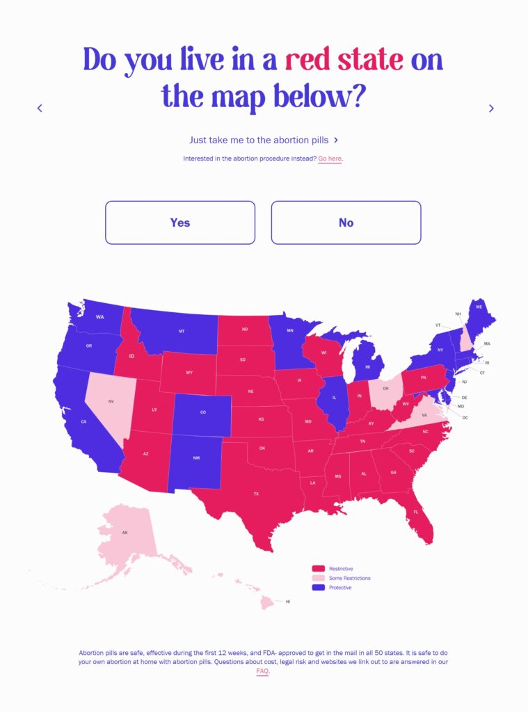 When users answer “yes” to living in a state shaded in red on the map, Mayday Health prompts users with multiple providers for abortion pills.