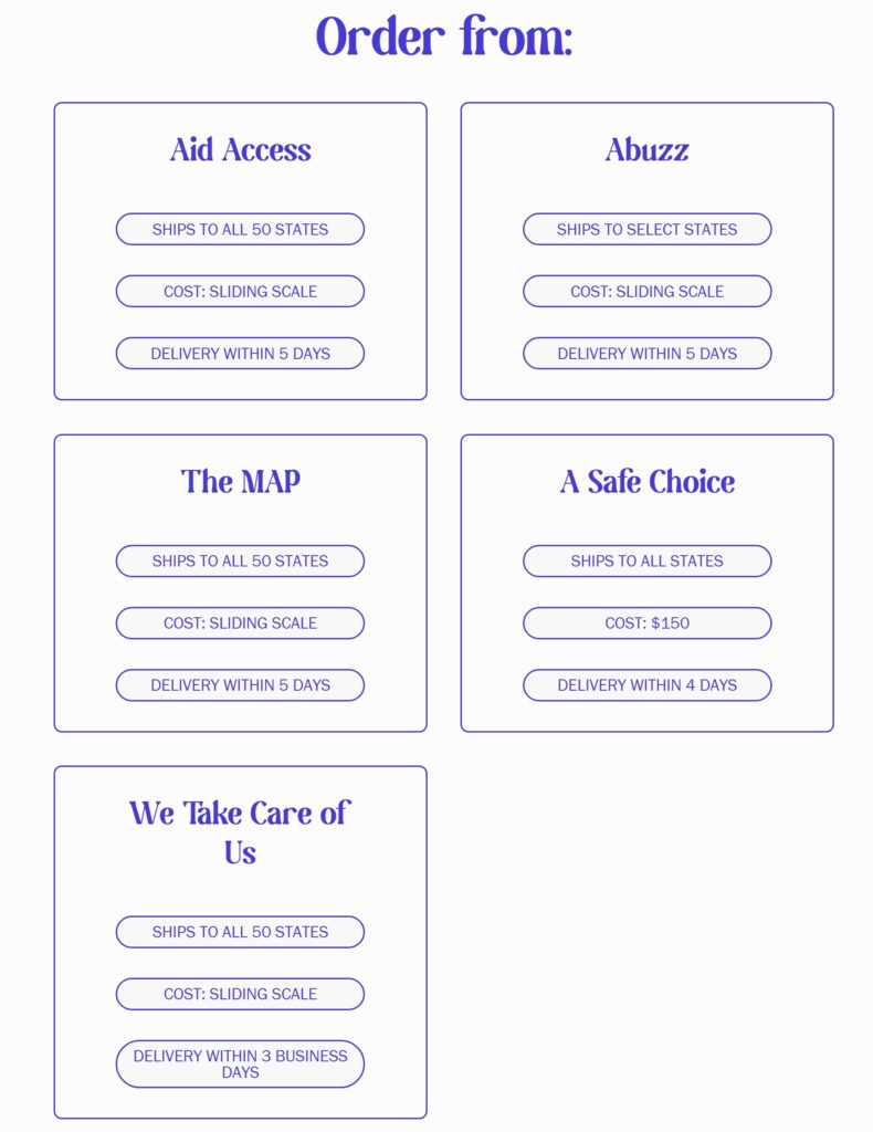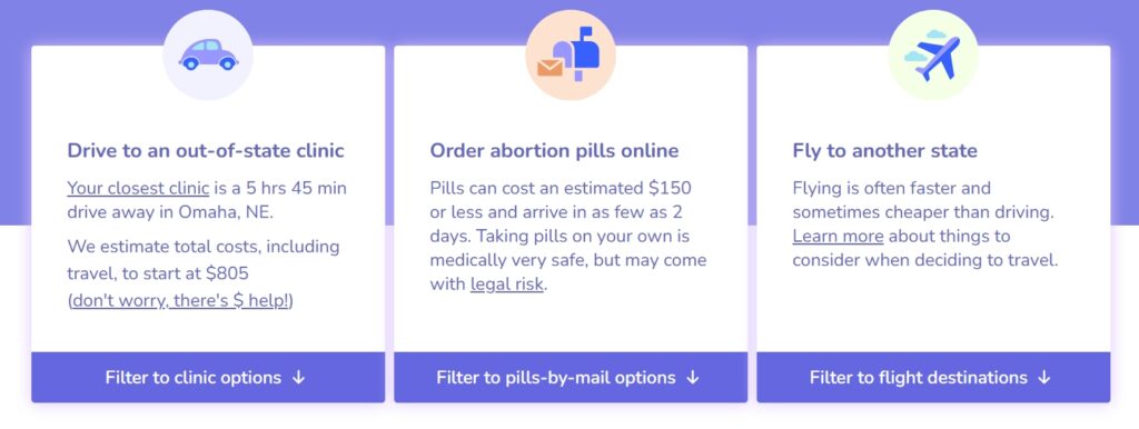 If a user decides to pursue obtaining abortion pills online—which “can cost an estimated $150 or less and arrive in as few as 2 days”—from ineedana.com, users are presented with several providers in “shield law” states.