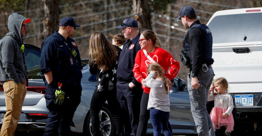 Parents who pulled out their kids from the Temple Israel synagogue stand near police after the Michigan State Police reported an active shooting incident there, in West Bloomfield, Michigan, March 12, 2026. (REUTERS/Rebecca Cook/File Photo)